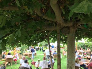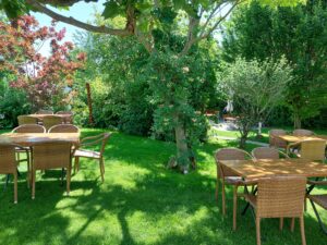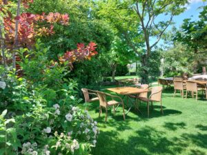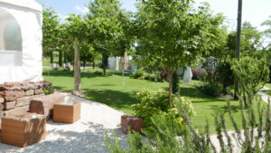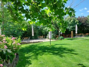 Unser großer Garten mit viel Himmel-Blau und Natur-Grün lädt ein zum Entspannen und Erholen.